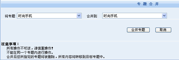 3、合并專題:進行專題的合并。一般情況下我們不會需要使用專題合并功能。專題合并的操作是將兩個專題的內(nèi)容(文章、圖片、商品等)合并到一個專題中去,若出現(xiàn)相同的內(nèi)容則自動忽略。