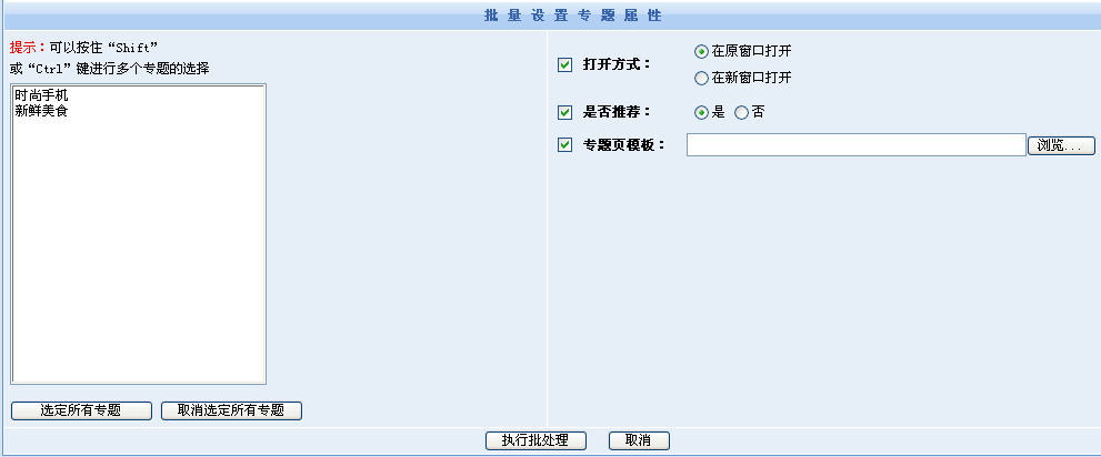 4、批量設(shè)置:這是為簡化操作而設(shè)計的功能,當(dāng)需要設(shè)置的專題數(shù)量很大的時候,一個個地設(shè)置專題就變得非常麻煩,使用批量設(shè)置則可一次性對N個專題進行設(shè)置。