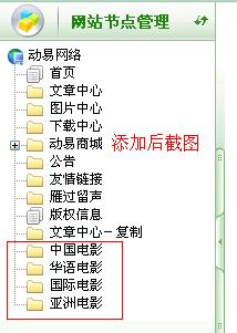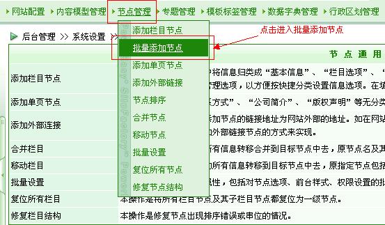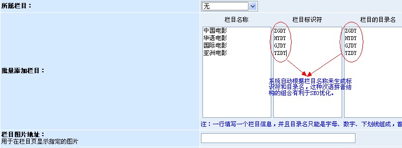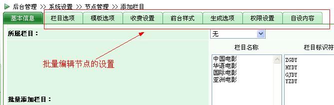 點擊“批量添加節(jié)點”后進入“節(jié)點批量增加”界面,每行為一個節(jié)點(如圖中所示:中國電影為一個節(jié)點、話語電影為一個節(jié)點…),值得一提的是,系統(tǒng)會自動根據(jù)欄目名稱來生成標識符和目錄名,這種漢語拼音結(jié)構(gòu)的組合形式有利于站點的SEO優(yōu)化: