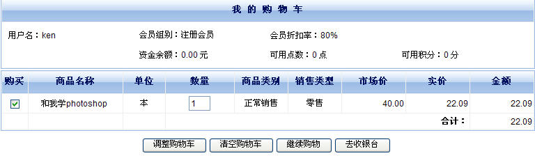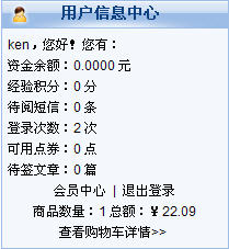我們新增加了一個隨身購物車的標簽: { PE. Label id="隨身購物車" / } ,這個標簽可以任意調(diào)用到各個頁面中去。在默認模板里,這個標簽與登錄的標簽放在一起,但其實是各自獨立的。在下圖里,我們看到這個標簽的實現(xiàn)效果:“商品數(shù)量:1,總額:22.09”。這樣的處理方式能為顧客的購物體驗帶來一些好處,顧客可以隨時地了解自己的購物車里的情況,而不需要跳轉(zhuǎn)到訂單詳情頁面,因此顧客選購的行為便減少了被打斷的可能。