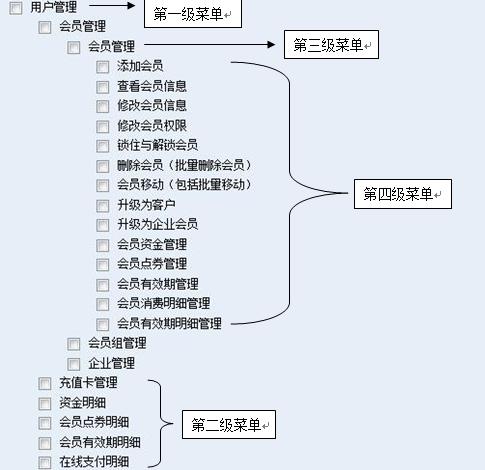 此類權(quán)限往往是對“大模塊類權(quán)限”的解構(gòu),也就是說“大模塊類權(quán)限”是由一個(gè)個(gè)小模塊類權(quán)限組合而成的。小模塊類權(quán)限往往會含有三級甚至四級的權(quán)限細(xì)分,如下圖中動易SiteFactory? 的“用戶管理”權(quán)限就包含有四級權(quán)限細(xì)分: