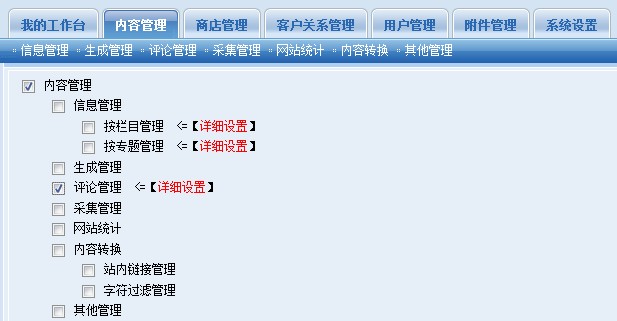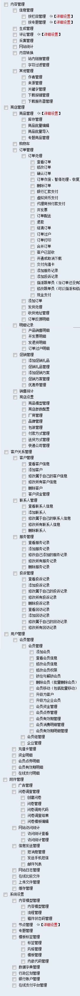 此外,樹狀目錄中的權(quán)限還配備了“詳細(xì)配置”的功能,為角色分配權(quán)限提供了更多種的配置途徑。下一節(jié)我們將以“信息管理”子模塊下的“按欄目管理”三級(jí)權(quán)限的詳細(xì)設(shè)置來(lái)進(jìn)行介紹節(jié)點(diǎn)的權(quán)限設(shè)置。