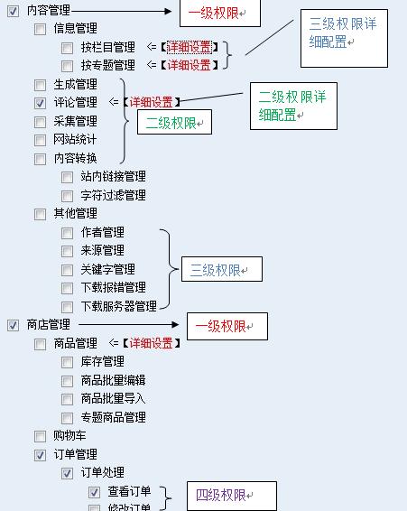從圖中我們可以看到,SiteFactory? 的角色權(quán)限可細(xì)分到四級(jí),每級(jí)權(quán)限都是上一級(jí)權(quán)限的再細(xì)分,如此龐大但聯(lián)系緊密的樹狀權(quán)限結(jié)構(gòu)就是“SiteFactory? 樹狀四級(jí)權(quán)限”。圖中“商品管理”——“訂單管理”——“訂單處理”——“查看訂單”的四級(jí)權(quán)限細(xì)分過程,直觀體現(xiàn)出了分工越來(lái)越細(xì)化的特點(diǎn),不僅讓網(wǎng)站單調(diào)的權(quán)限與現(xiàn)實(shí)社會(huì)分工細(xì)化的趨勢(shì)相互掛鉤起來(lái),而且進(jìn)一步證明基于標(biāo)準(zhǔn)RBAC模型(角色)的訪問控制方法的優(yōu)勢(shì)所在。相信采用角色來(lái)處理權(quán)限的SiteFactory? 更能適應(yīng)政府、事業(yè)單位、企業(yè)等日常部門較多、分工較細(xì)化領(lǐng)域的需求。