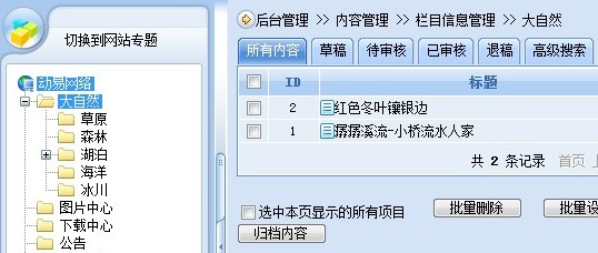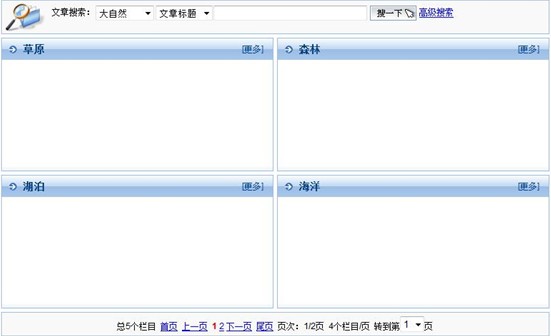 最后,瀏覽前臺(tái)可以看到,雖然沒有設(shè)置“欄目首頁模板”,但“大自然”欄目依然分頁顯示出了其子欄目,如下圖所示: