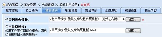 c、“大自然”節(jié)點(diǎn)的模板選項(xiàng)設(shè)置了“欄目列表頁模板”、“欄目首頁模板”及“內(nèi)容頁模板”。