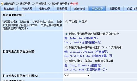 其次,“生成選項(xiàng)”設(shè)置如下圖所示,生成欄目列表頁。