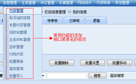 如果說SiteFactory? 1.0的菜單是功能的改進(jìn),那么新版本的菜單將是便利性的改進(jìn)。新版本將常用功能和拗口菜單名稱進(jìn)行了添加和修改,更符合大家的操作習(xí)慣。比如,“信息管理”、“專題管理”兩個菜單,被“內(nèi)容管理”所取代,這樣更利于操作和理解。