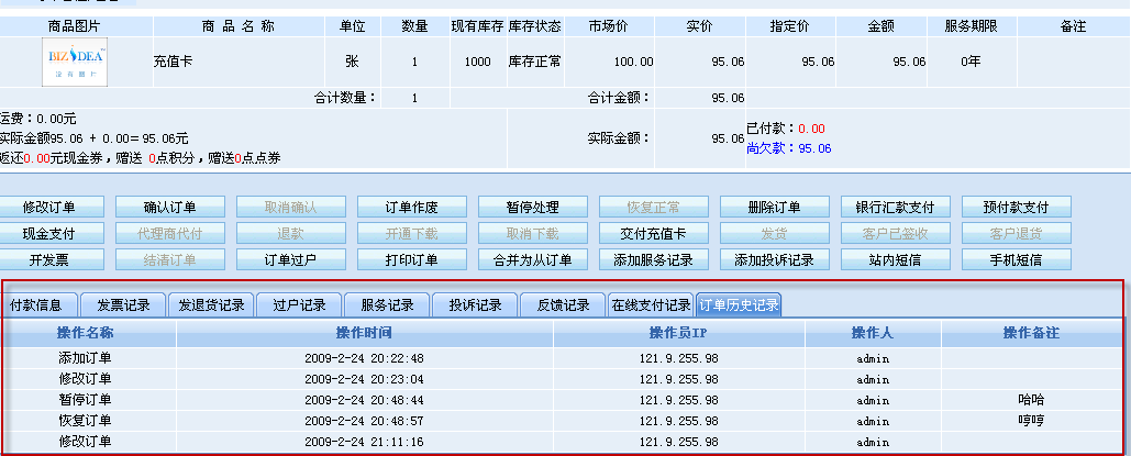 從上圖我們可以看到,在訂單處理頁面下方的“訂單歷史記錄”里,系統(tǒng)詳細(xì)記錄了該訂單每一次歷史操作記錄,包括操作名稱、操作時間、操作員IP、操作人、操作備注等等,一覽無遺。