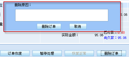 此外,對于訂單作廢、訂單暫停處理\恢復(fù)正常、刪除訂單等在訂單處理過程中的關(guān)鍵操作步驟,在執(zhí)行操作前還必須錄入操作原因,如作廢原因、暫停處理原因、刪除訂單原因等,以進(jìn)一步確保該訂單得到安全妥善的處理。(圖2、3)