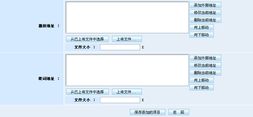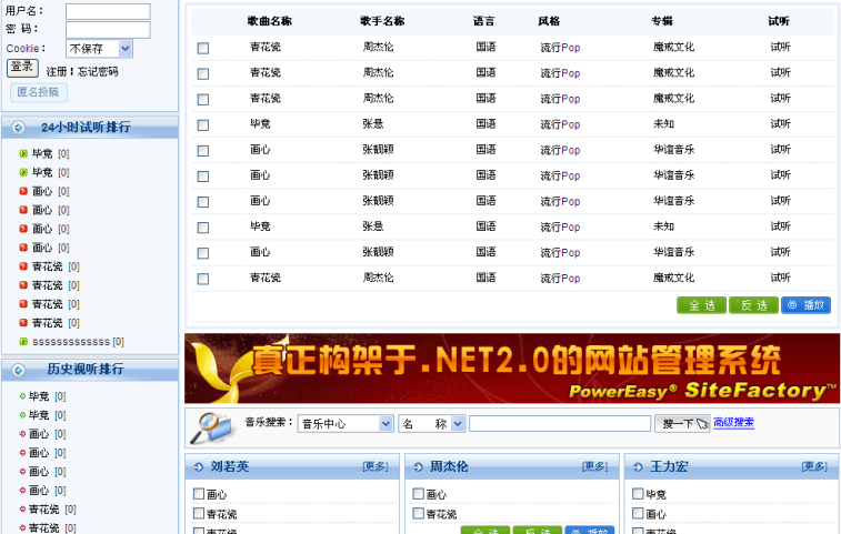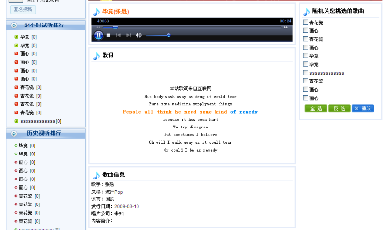 同時(shí),新增的音樂模型還還配置了專門的前臺(tái)頁面模板,內(nèi)置了一系列標(biāo)簽,如24小時(shí)試聽排行、歷史試聽排行、網(wǎng)友推薦歌曲等,前臺(tái)用戶可以直接點(diǎn)擊這些排行榜單,迅速找到各種熱門歌曲,可以選擇多個(gè)歌曲進(jìn)行連續(xù)播放,可以隨機(jī)播放歌曲,可以自動(dòng)播放LRC歌詞。另外,系統(tǒng)還可以支持根據(jù)音樂名稱、歌手、風(fēng)格、唱片公司等進(jìn)行音樂搜索,以及更復(fù)雜的高級(jí)搜索功能。