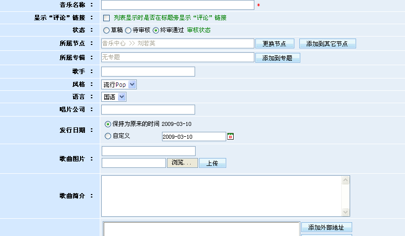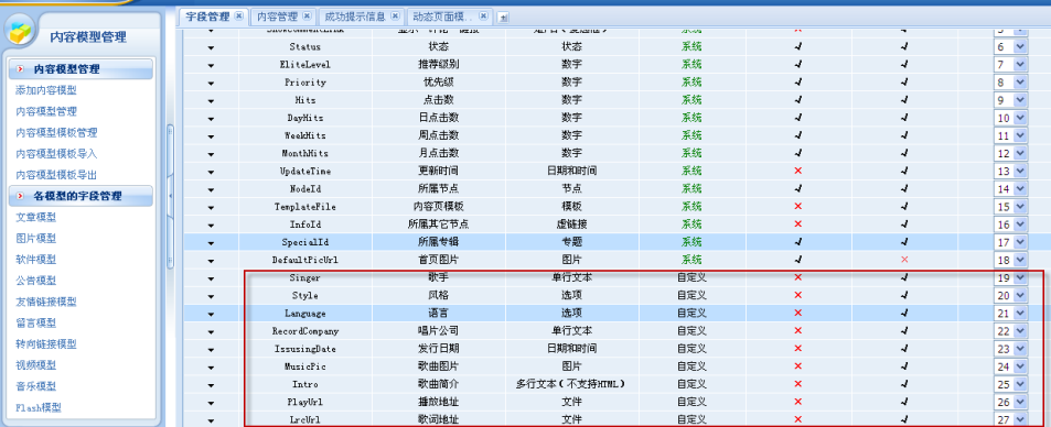 在新增的音樂模型里,系統(tǒng)已經(jīng)預(yù)置了一系列的相關(guān)字段,包括歌詞地址、播放地址、歌曲簡(jiǎn)介、歌曲圖片、發(fā)行日期、唱片公司、語言、風(fēng)格、歌手等等,并根據(jù)不同字段的特點(diǎn)選擇了不同的字段類型。當(dāng)然,網(wǎng)站管理員也可根據(jù)自身需要自行添加其它更多的字段。