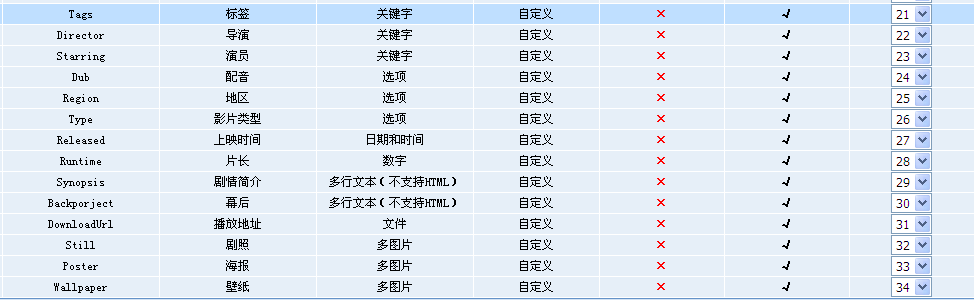 在視頻模型中,新增的自定義字段多達(dá)十幾個,包括:標(biāo)簽、演員、導(dǎo)演、配音、地區(qū)、影片類型、上映時間、片長、劇情介紹、幕后、播放地址、劇照、海報(bào)、壁紙等等,基本可以滿足站長對構(gòu)建視頻模塊的常見需求,另外站長還可自行新增字段或者對已有字段進(jìn)行修改,以滿足自己的更多個性化需求。