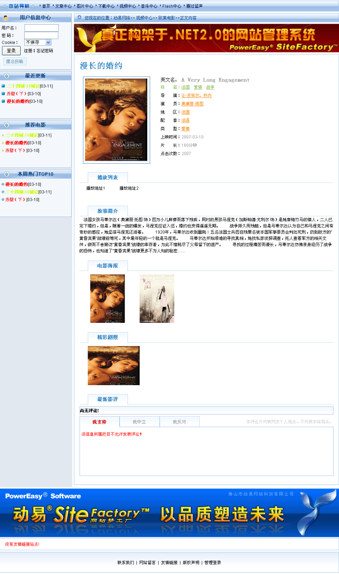 而在視頻模型專門配置的前臺頁面模板中,還內(nèi)置了一系列的標(biāo)簽,如分類檢索、推薦電影、本周排名、新片速遞、推薦視頻、最新影評等等,前臺用戶可以在線觀看視頻、可以按標(biāo)簽、演員、導(dǎo)演、配音、地區(qū)、影片類型、上映時間、片長、劇情介紹、幕后等字段對站內(nèi)視頻進(jìn)行搜索,可以對視頻發(fā)表評論,還可以查看到各種視頻排行榜單。