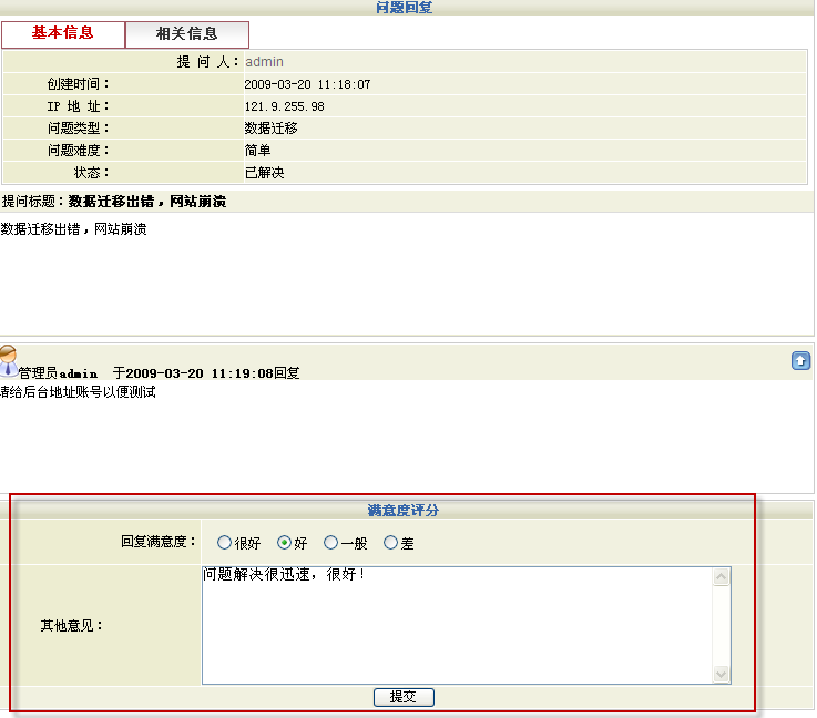 企業(yè)可預(yù)先設(shè)置好不同的問題回復(fù)滿意度評分選項,客戶在問題解決后可對客服人員的回復(fù)情況進行評分和撰寫意見,從而可以對企業(yè)客戶人員的服務(wù)質(zhì)量起到更好的監(jiān)督和促進作用。