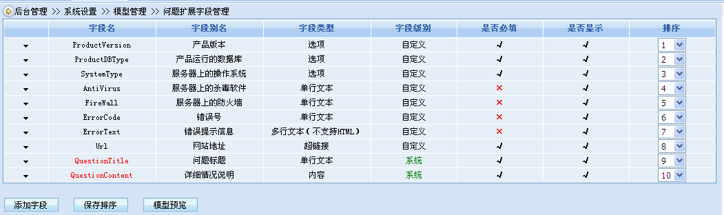 可自定義問答類型,滿足各行業(yè)細分要求。如在軟件銷售行業(yè)中,將問答類型設(shè)置為產(chǎn)品版本、錯誤號、提示信息等與軟件使用相關(guān)的問答選項,可建立軟件公司自己的售后服務(wù)中心(商業(yè)或非商業(yè));又如在硬件銷售行業(yè)中,作為硬件產(chǎn)品的客服中心可以添加硬件的產(chǎn)品型號、購買日期、購買地點、故障信息描述等問題模型字段,等等。通過模型強大的自定義字段功能,滿足各種行業(yè)的不同需求。