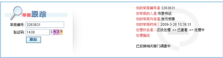公眾在前臺(tái)可以輸入舉報(bào)編號(hào)來(lái)實(shí)時(shí)查詢到所舉報(bào)事件的處理情況和處理結(jié)果。