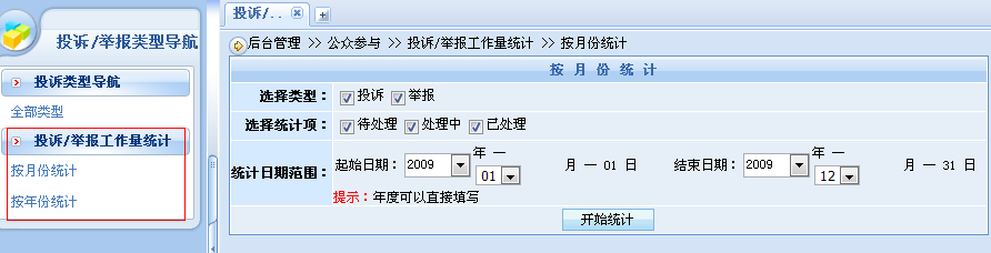 為方便政府對(duì)投訴舉報(bào)工作的處理情況進(jìn)行檢查和監(jiān)督,系統(tǒng)提供了工作量統(tǒng)計(jì)功能。為符合政府部門日常工作習(xí)慣,內(nèi)置“按月份”和“按年份”對(duì)信息進(jìn)行工作量統(tǒng)計(jì)。
