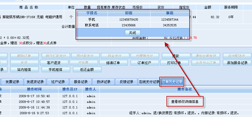 在BizIdea? 2.5版本里,我們增加了訂單歷史記錄的功能,對于管理員對于單個訂單的每一步操作,系統(tǒng)都將把操作步驟、操作人、操作時間、操作員IP等詳細信息全部記錄下來,以供商家或管理員隨時查看。但對于“修改訂單”這個操作處理來說,由于訂單上有著收貨人各種聯(lián)系資料、開票信息、商品信息等等非常多的信息和字段要素,有時候商家或管理員除了要查看操作人和操作時間外,還需要查看操作員對訂單各項信息進行了怎樣的具體修改。BizIdea? 3.0里系統(tǒng)就應需增加了查看訂單修改詳細歷史記錄的功能,點擊修改訂單記錄操作備注的“查看修改詳細信息”即可在彈出框中查看到操作員在本次操作中對訂單信息進行修改的字段名、舊值和新值: