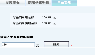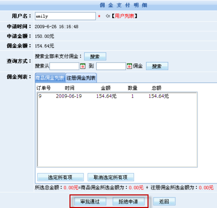如需對(duì)傭金進(jìn)行提現(xiàn),則可以在“提現(xiàn)明細(xì)”里申請(qǐng)?zhí)岈F(xiàn),網(wǎng)店管理員在后臺(tái)審批通過(guò)后即可將傭金款項(xiàng)打到會(huì)員帳戶里。