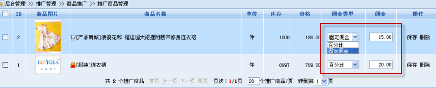 然后我們需要為每個(gè)推廣商品設(shè)定傭金類型和傭金值,如選擇固定傭金或百分比傭金: