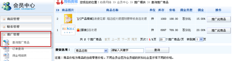 前臺(tái)會(huì)員可以在會(huì)員中心左側(cè)看到“推廣管理”模塊,首先可在“查詢推廣商品”查看到網(wǎng)店的所有推廣商品,如需推廣商品,則直接點(diǎn)擊商品列表后的“推廣此商品按鈕”:
