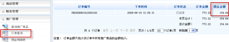 而一旦有人通過(guò)推廣鏈接到網(wǎng)店完成下單購(gòu)買商品并結(jié)清訂單后,系統(tǒng)便將自動(dòng)給推廣會(huì)員發(fā)放傭金: