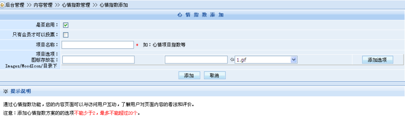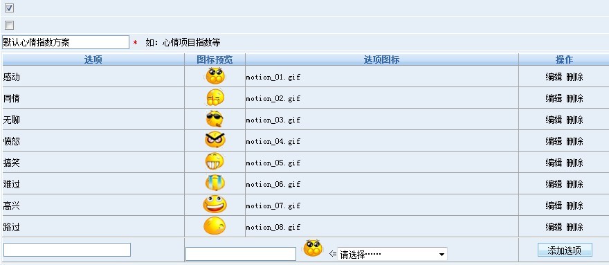 現(xiàn)在,在SiteFactory3.0版本中,大家就可以在自己網(wǎng)站上使用上這個(gè)心情指數(shù)功能啦!用戶可以在后臺(tái)心情指數(shù)管理中任意添加多套不同的心情指數(shù),以備前臺(tái)輪換使用。而且,為了讓用戶可以實(shí)現(xiàn)開箱即用,系統(tǒng)已預(yù)先內(nèi)置了一套心情指數(shù)方案: