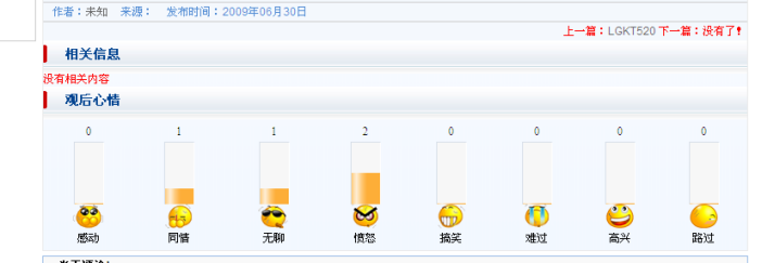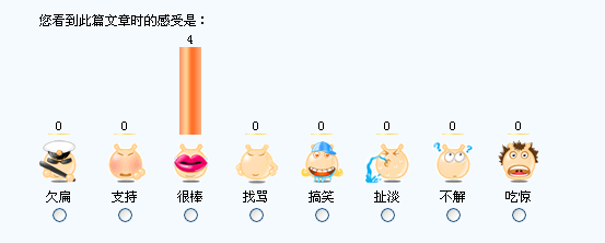 很熟悉吧,我們在不少網(wǎng)站都看到過這樣的功能了,瀏覽完新聞后隨手點(diǎn)擊下以發(fā)表自己對該新聞的心情和情緒,各種可愛的卡通心情圖標(biāo),相信很多瀏覽者都會(huì)樂于隨手點(diǎn)擊一下的。而對于網(wǎng)站來說,心情指數(shù)的功能無疑為時(shí)下非常有效的一種增進(jìn)用戶與網(wǎng)站互動(dòng)的良好方式,相比起需要用戶經(jīng)過思考并書寫發(fā)表評論這種傳統(tǒng)的互動(dòng)方式來說,心情指數(shù)功能可以讓用戶更直接、簡單而快捷地抒發(fā)自己的閱讀心情,而夸張又搞笑的各種心情代表卡通頭像更是吸引著用戶因?yàn)楹猛娑鴧⑴c到網(wǎng)站互動(dòng)中來。