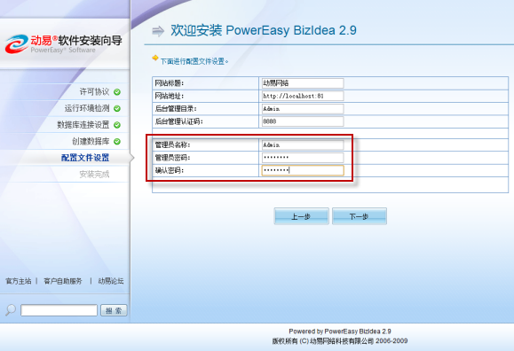 我們看到在頁面的左側(cè)列出了安裝的所有步驟,以方便用戶查看。此外,還可以在安裝向?qū)О惭b結(jié)束時直接修改管理員登錄的用戶名、密碼等帳號信息,也非常便捷: