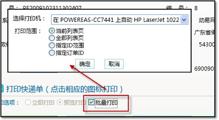 對(duì)于多個(gè)采用同一家快遞公司發(fā)貨的訂單,系統(tǒng)還支持快遞單批量打印功能,只需指定好打印范圍即可進(jìn)行批量快速打印。