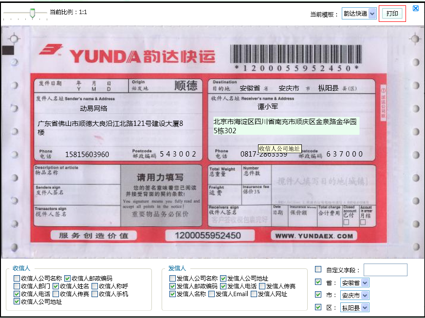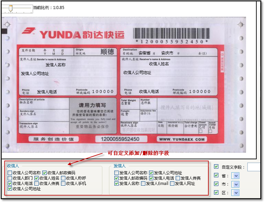 可自行添加各個(gè)不同快遞公司的快遞單模板,并可根據(jù)具體情況對(duì)快遞單需打印字段進(jìn)行自定義勾選添加或刪除,如收信人姓名、收信人公司名稱、發(fā)信人地址、發(fā)信人聯(lián)系電話等等。